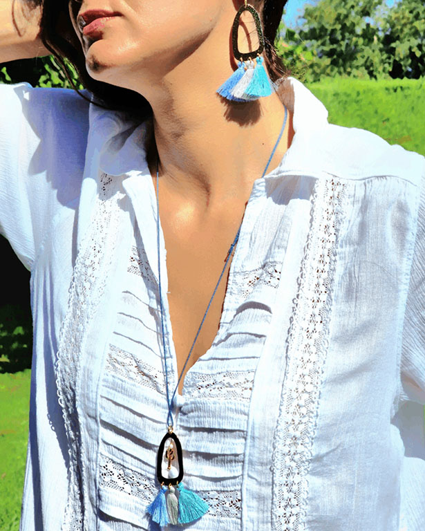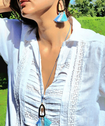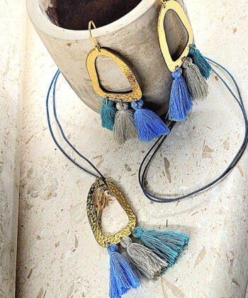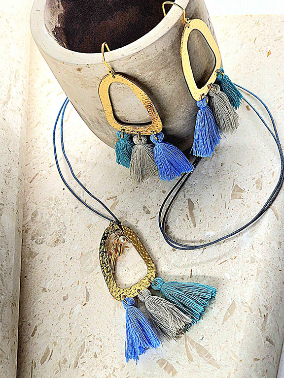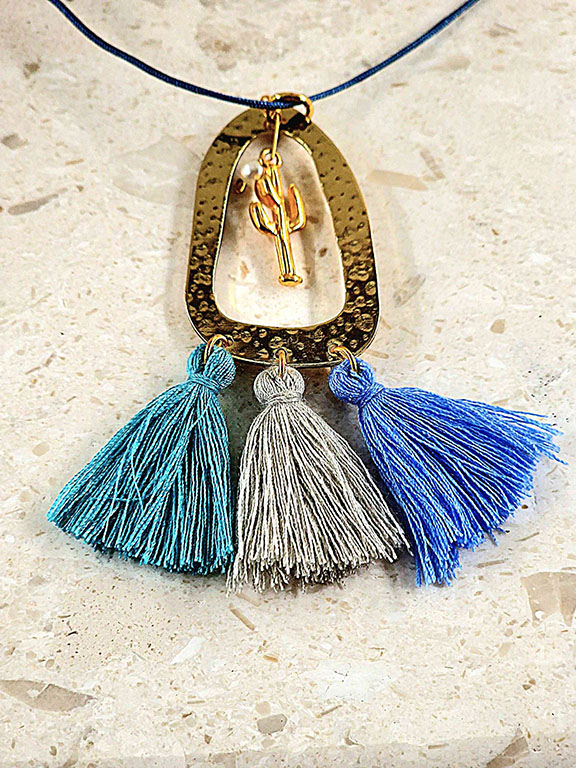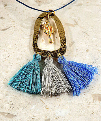 • Χειροποίητο κολιέ από σφυρηλατημένο επιχρυσωμένο ορείχαλκο με κάκτο στη μέση και τελείωμα με κρεμαστές πολύχρωμες φούντες.