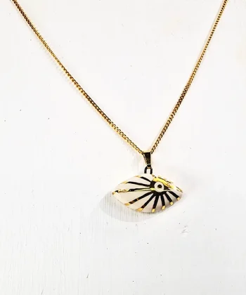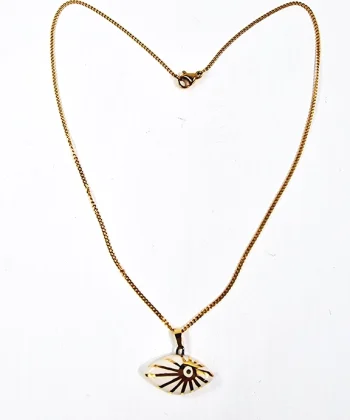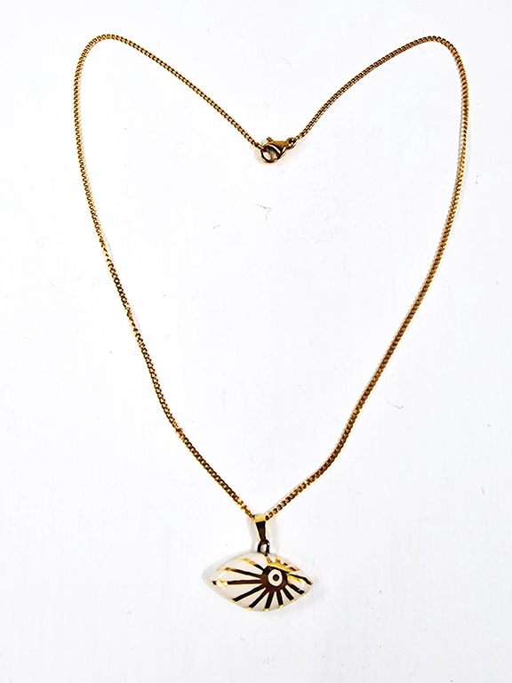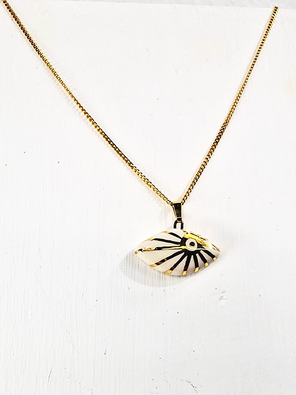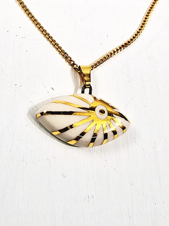 • Χειροποίητο κεραμικό κολιέ με σχέδιο ήλιο με χρυσό σμάλτο και αλυσίδα από ανοξείδωτο ατσάλι σε χρυσό χρώμα.
