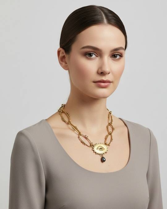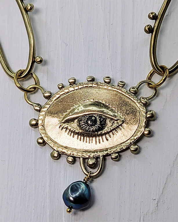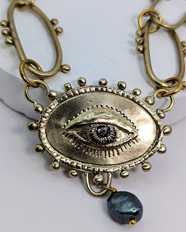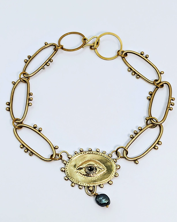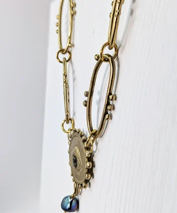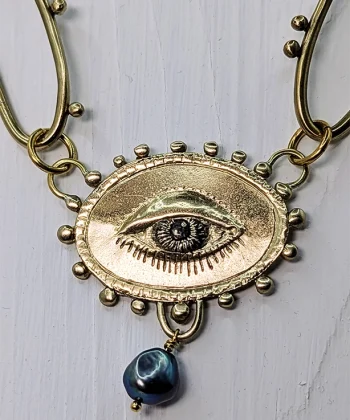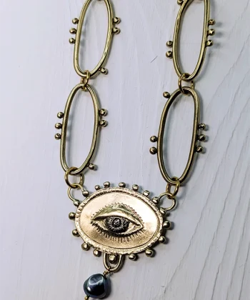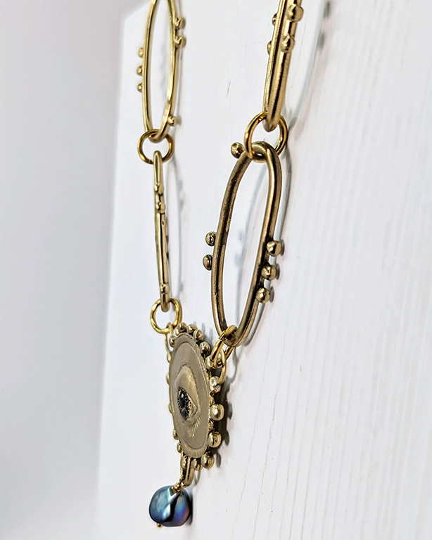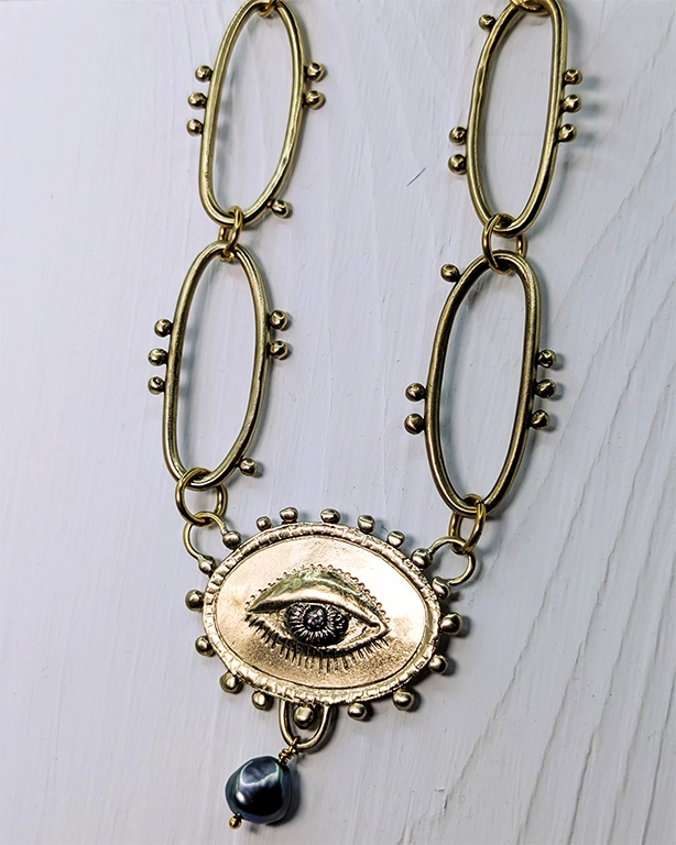 • Χειροποίητο κολιέ από επιχρυσωμένο ορείχαλκο με χαραγμένο μάτι και κρεμαστό γκρι μαργαριτάρι.
