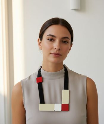 - Χειροποίητο κολιέ tetris σε άσπρο, μπεζ και κόκκινο χρώμα από plexi glass με μαύρο ιμάντα.