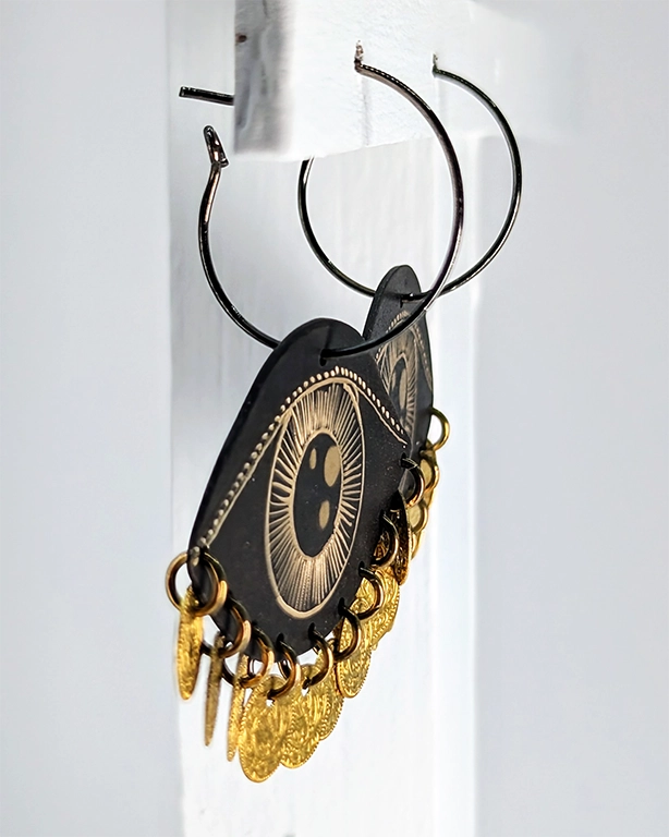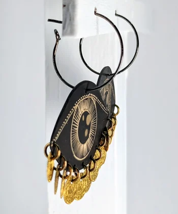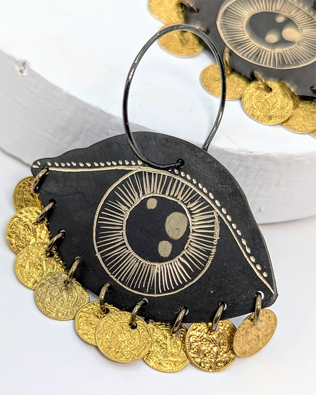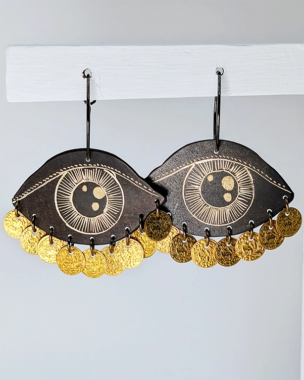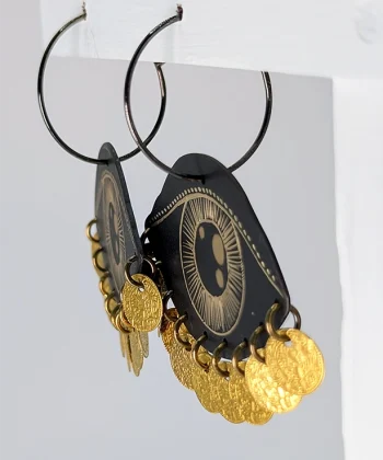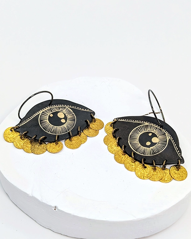 • Χειροποίητα σκουλαρίκια από ορείχαλκο με επίχρυση χάραξη σε σχήμα μάτι και κρεμαστά χρυσά νομίσματα.