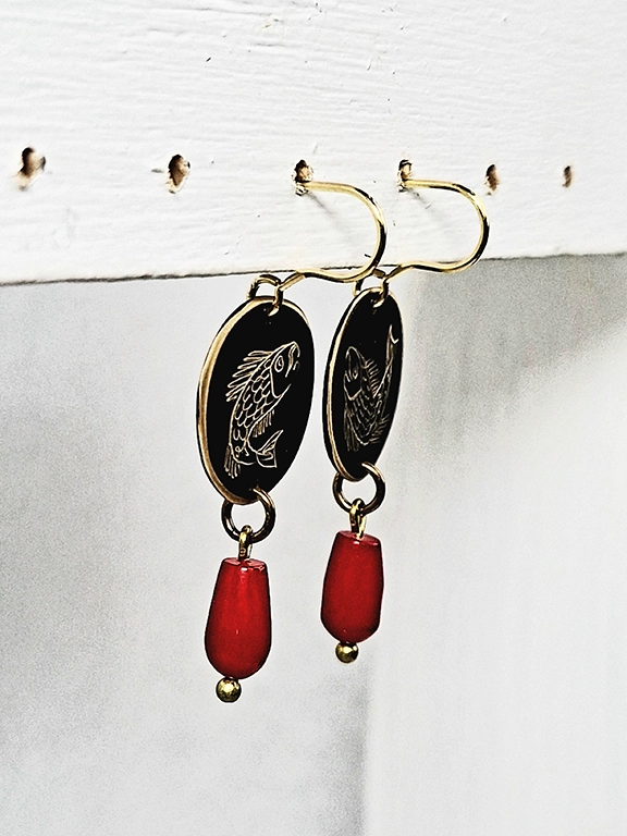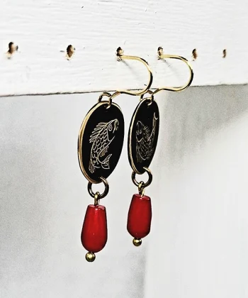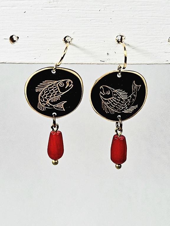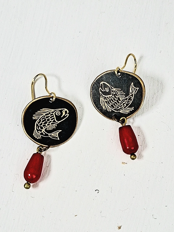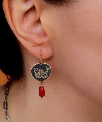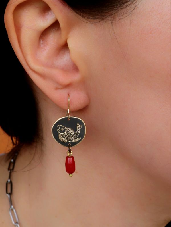 • Χειροποίητα μικρά σκουλαρίκια σε οβάλ σχήμα με χαραγμένο σχέδιο ψάρι και κρεμαστό κοράλι.