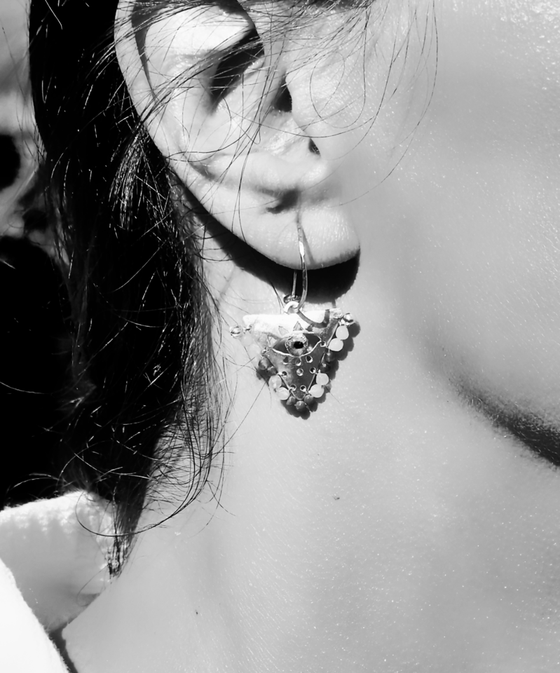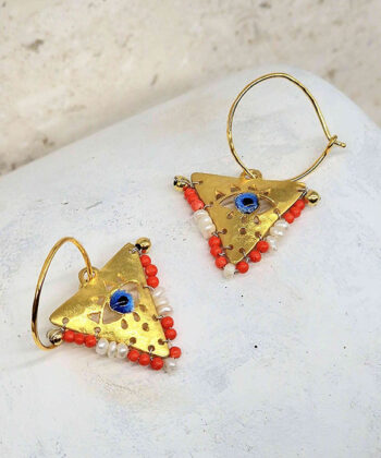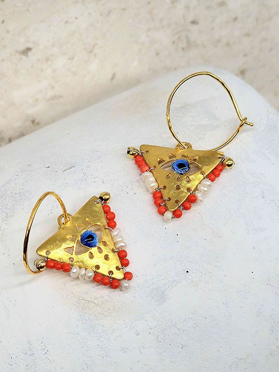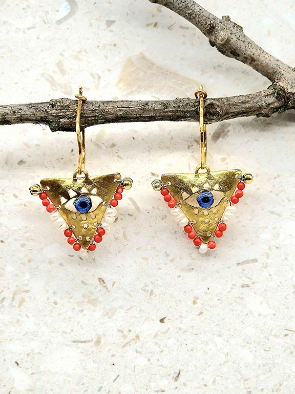 • Σκουλαρίκια μεσαία τρίγωνα, σκαλιστά φυλαχτά, με μπλε ματάκι, από επιχρυσωμένο ασήμι 925, με λευκές και κόκκινες ημιπολύτιμες χάντρες.