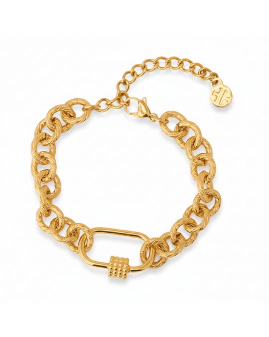 - Βραχιόλι αλυσίδα με κεντρική διακοσμημένη λεπτομέρεια, σε χρυσό.