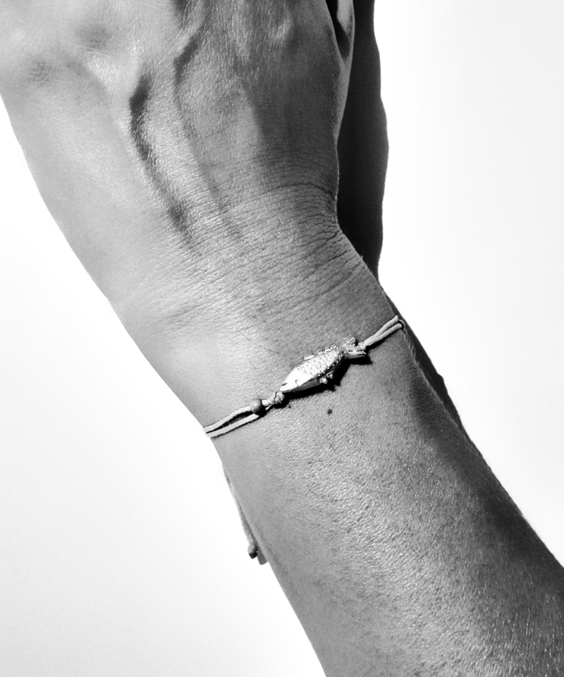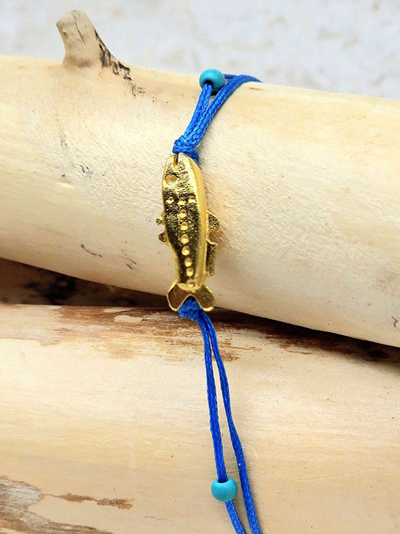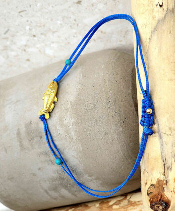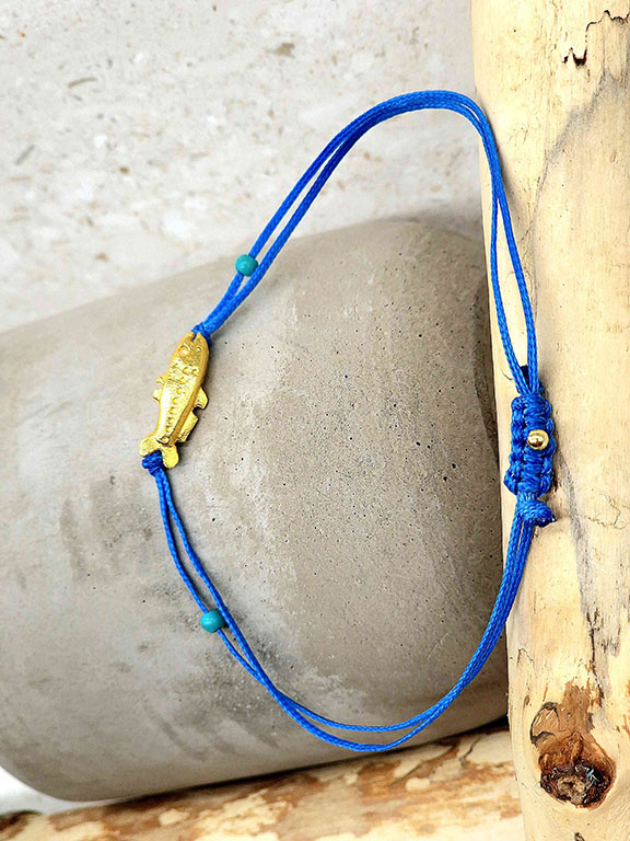 • Βραχιόλι ψαράκι σκαλιστό από επιχρυσωμένο ασήμι 925, με κερωμένο μπλε κορδόνι.